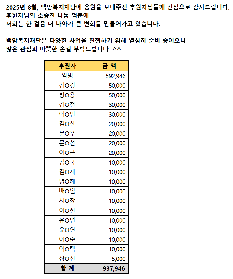 2025년 8월, 백암복지재단에 응원을 보내주신 후원자님들께 감사인사 올립니다. |