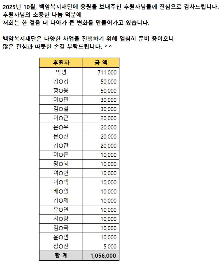 HOME > 커뮤니티 > 자유게시판| 2025년 10월, 백암복지재단에 응원을 보내주신 후원자님들께 감사인사 올립니다. |